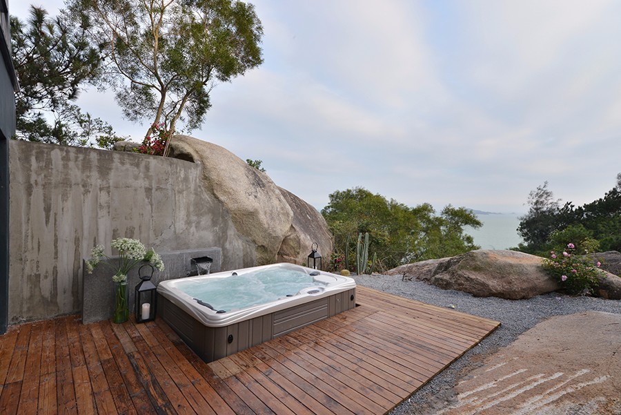 民宿建在一堆亂石上面,露天浴缸可以讓人一邊泡澡,一邊眺望美麗的海景。