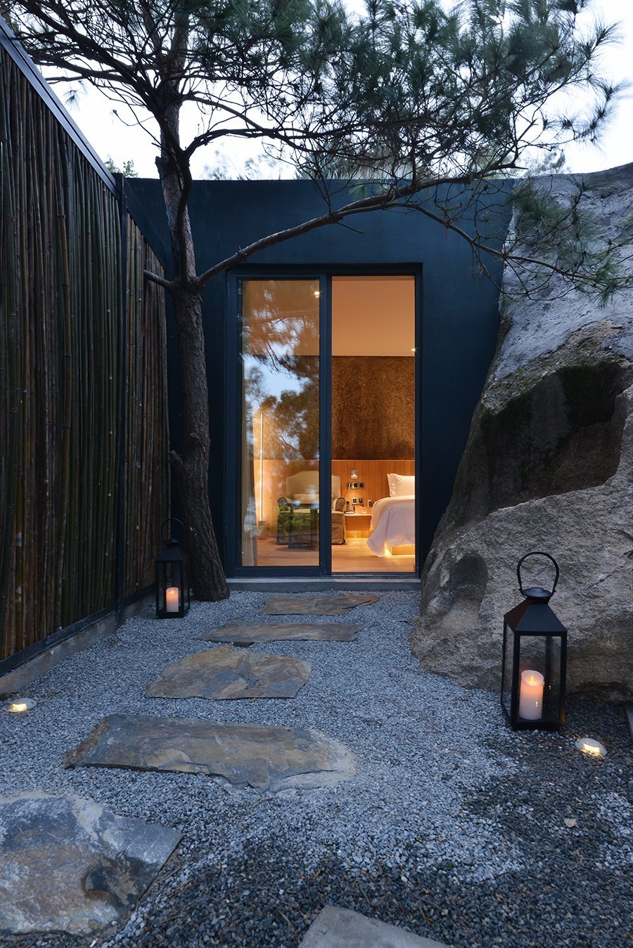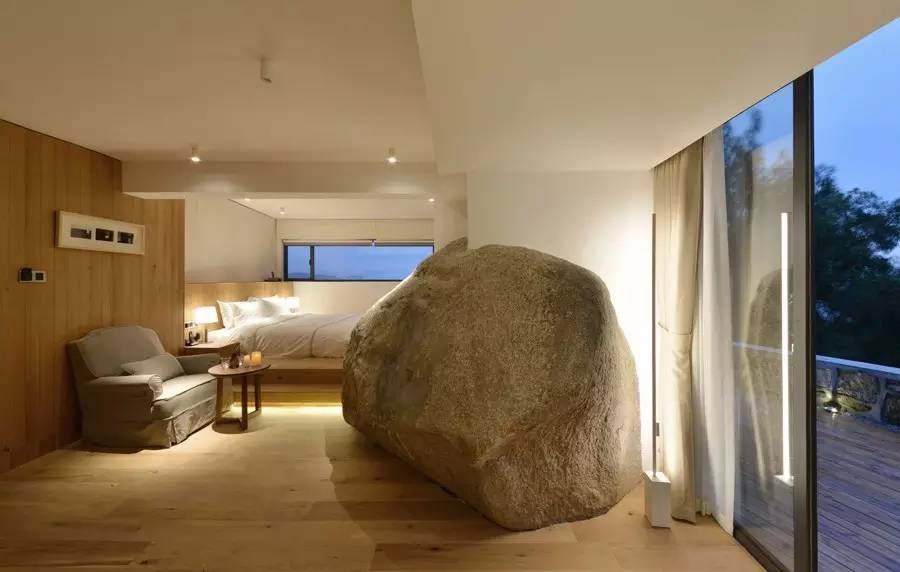 有3個房間是就著山體改造的,我們在房間里留下了大石頭。我們的本意是增加自然的元素,不過客人的反饋也很有趣:石頭是活的,睡覺的時候有點緊張!