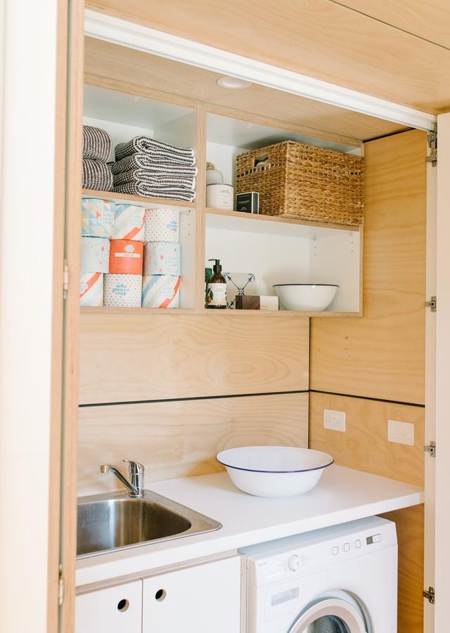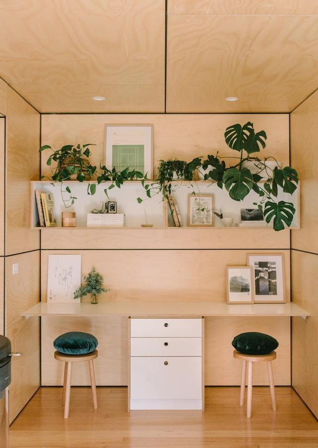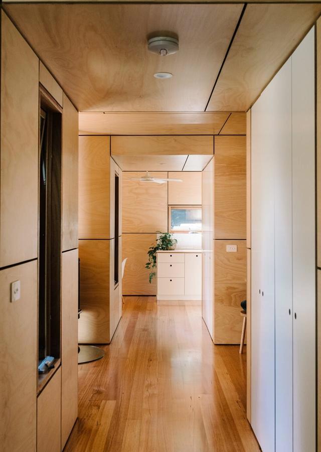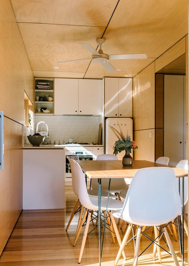 住宅的入口通往第一個集裝箱中的廚房和用餐區。生態膠合板墻、天花板和櫥柜,以及塔斯馬尼亞橡木地板,增加了外部金屬覆層的溫暖對比。