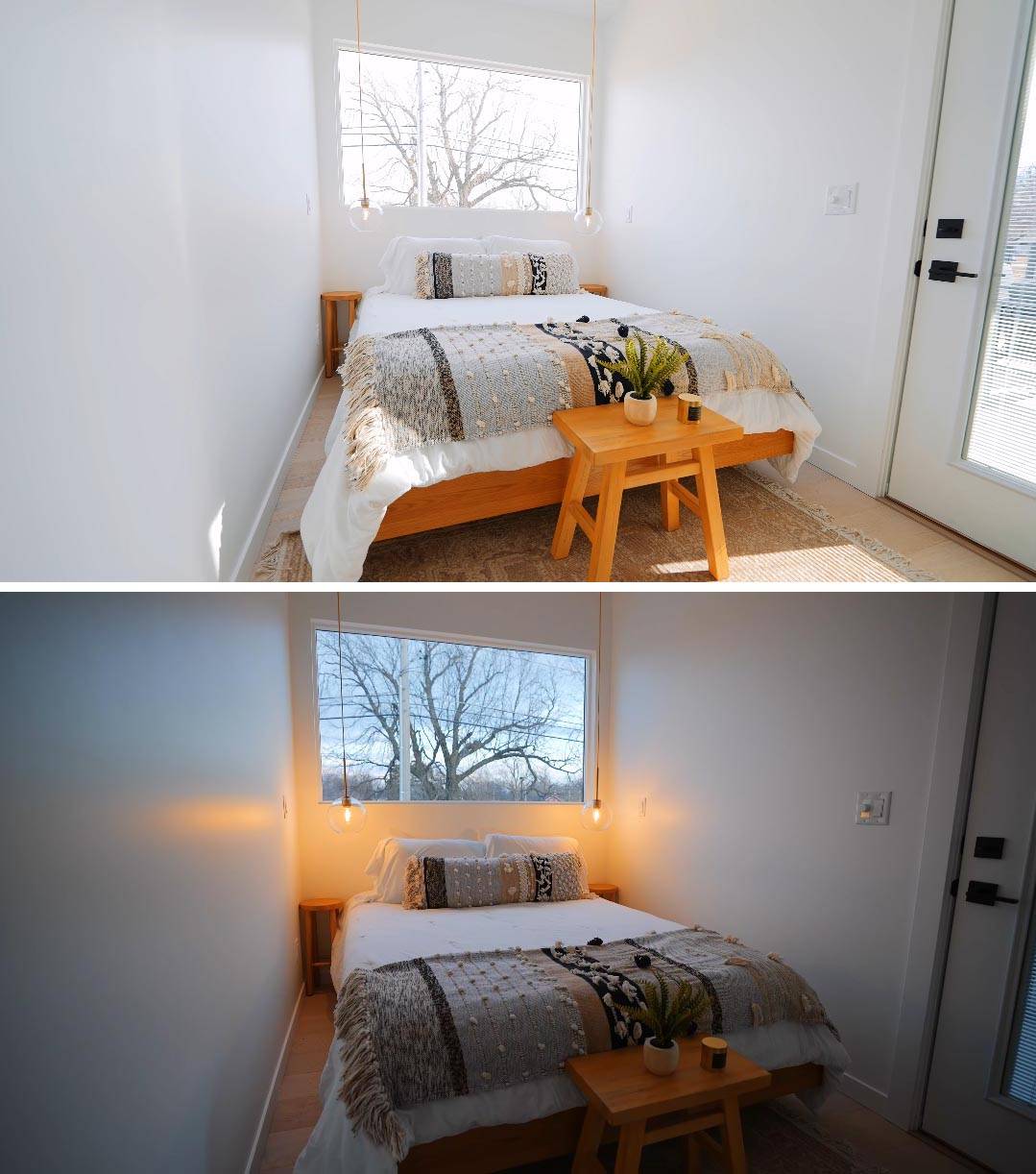 通過白色扶手的木樓梯,通向了私人臥室和衛生間的區域。一個超大的落地窗可以看到窗外的美景,同時它的高度也保證了臥室內的隱私性。同樣臥室內的并沒有太多復雜的設計,一張床幾乎占據了大半個空間,所以太多的設計反而是一種雞肋。