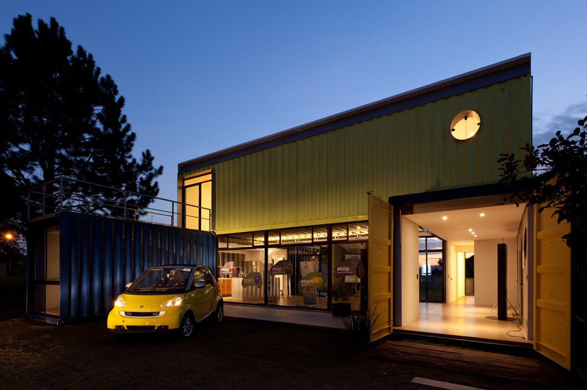 由4個集裝箱建成的房屋共兩層,有客廳、綜合餐廳、美食廚房、辦公室、三間浴室、三間臥室、服務區,還有車庫和陽臺。