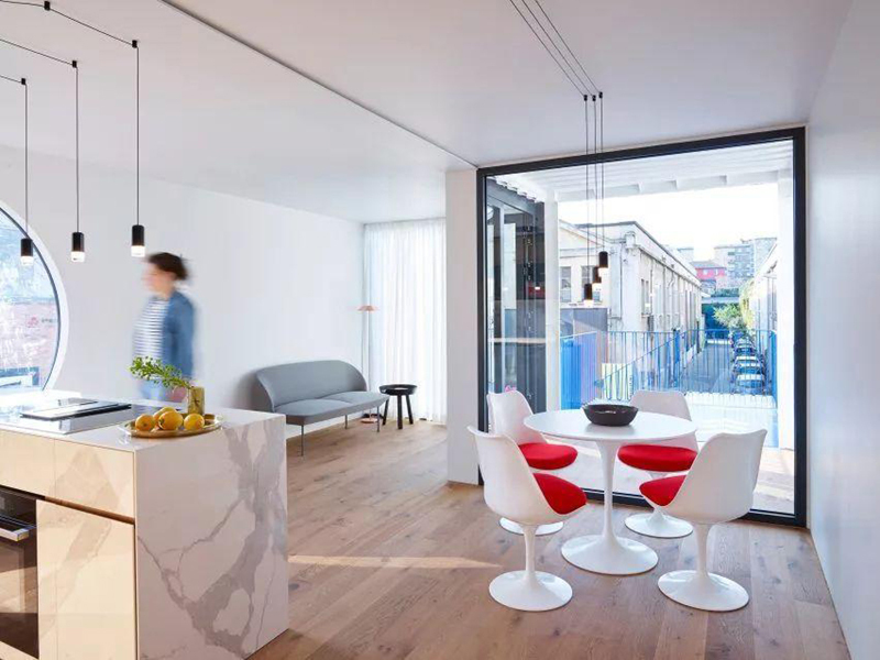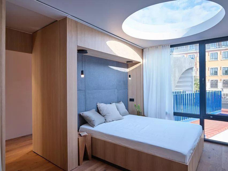 整個集裝箱別墅正面沒有過多的運用全落地玻璃,只是開了一個原型的玻璃。想要看到里面究竟有什么就去里面一探究竟吧。