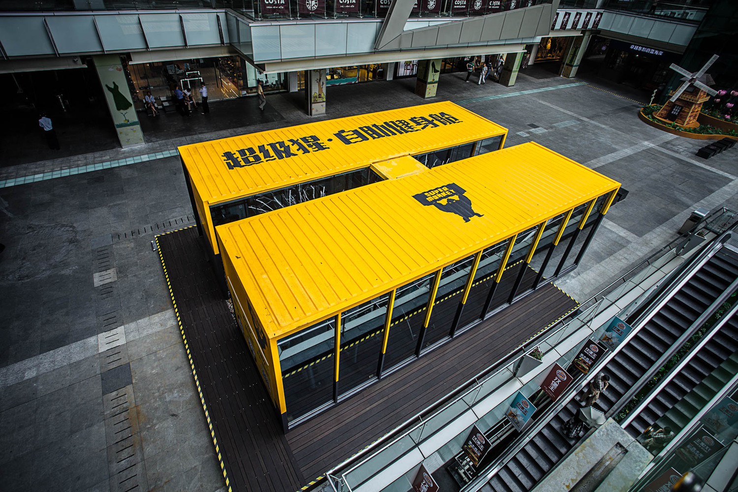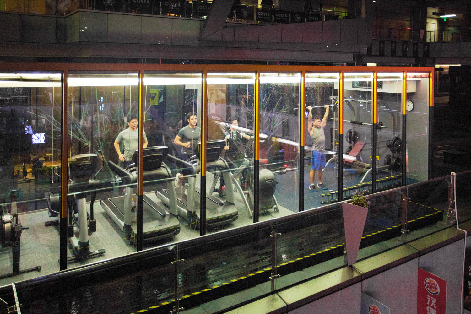 項目由兩個集裝箱拼接而成,中間為走廊,北側箱體面為落地玻璃,保證了艙體內部的通透性。總建筑面積86㎡,內部設有更衣室,有氧訓練區,力量訓練區。主要訓練器械有啞鈴,杠鈴,史密斯架,龍門架,跑步機,橢圓機,劃船機等。雖然沒有大型健身場館內的器械眾多,但是保證了普通用戶的使用需求。