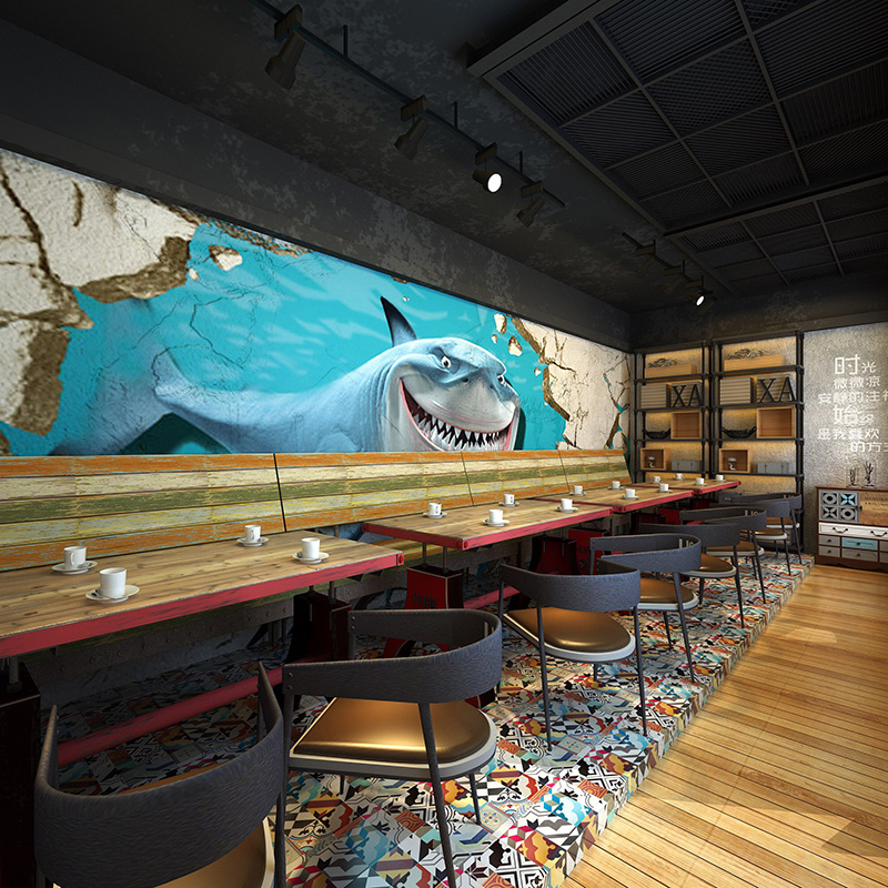 該烤魚館的裝飾采用“北歐風格”,淺色的木質(zhì)桌子與木質(zhì)地板跟周圍墻體圖案相互映襯,具有簡約、自然、人性化的特點,在此吃魚,定能吃出不一樣的感覺!