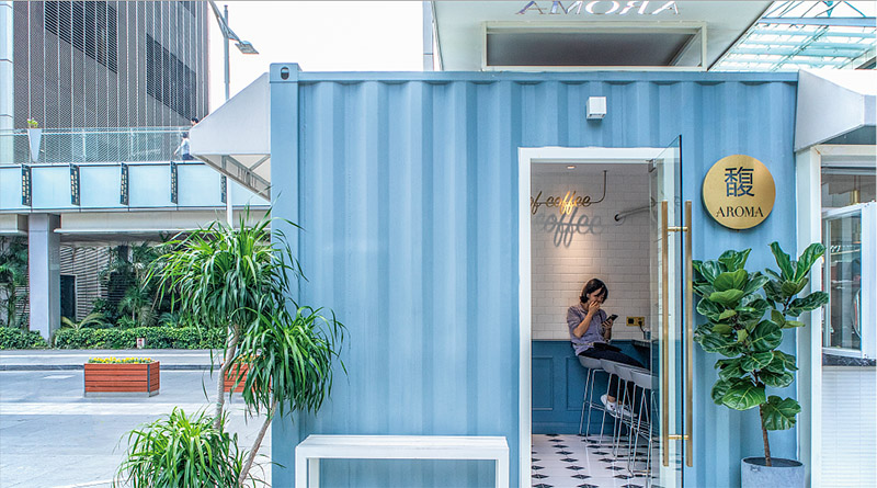Aroma Coffee 藏在福田 CBD 的一群高樓大廈底下,低飽和度的霧靄灰藍色集裝箱外形在深圳來說,還是有一分與眾不同,開業不久就已成為附近白領的每日打卡點。